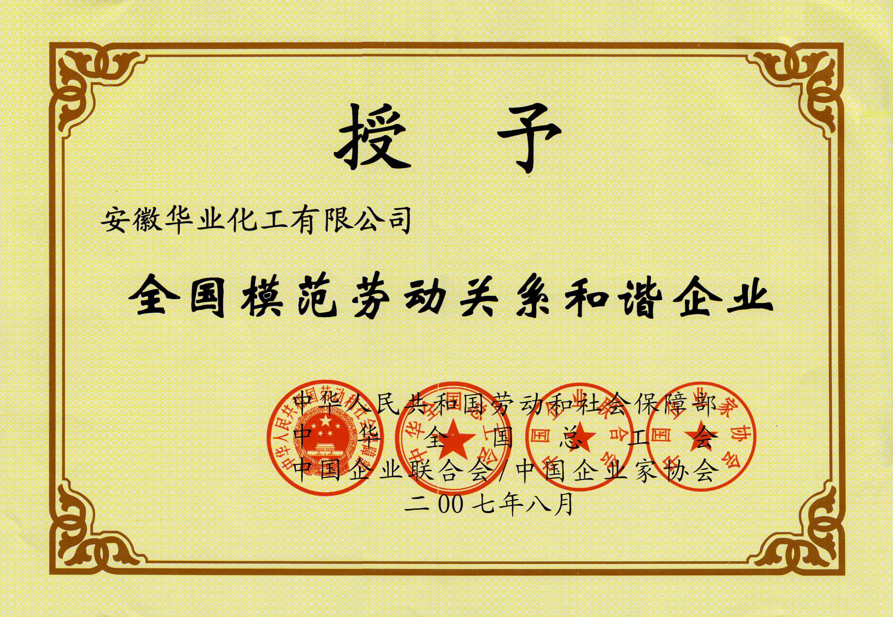2007年8月榮獲全國模范勞動關(guān)系和諧企業(yè)