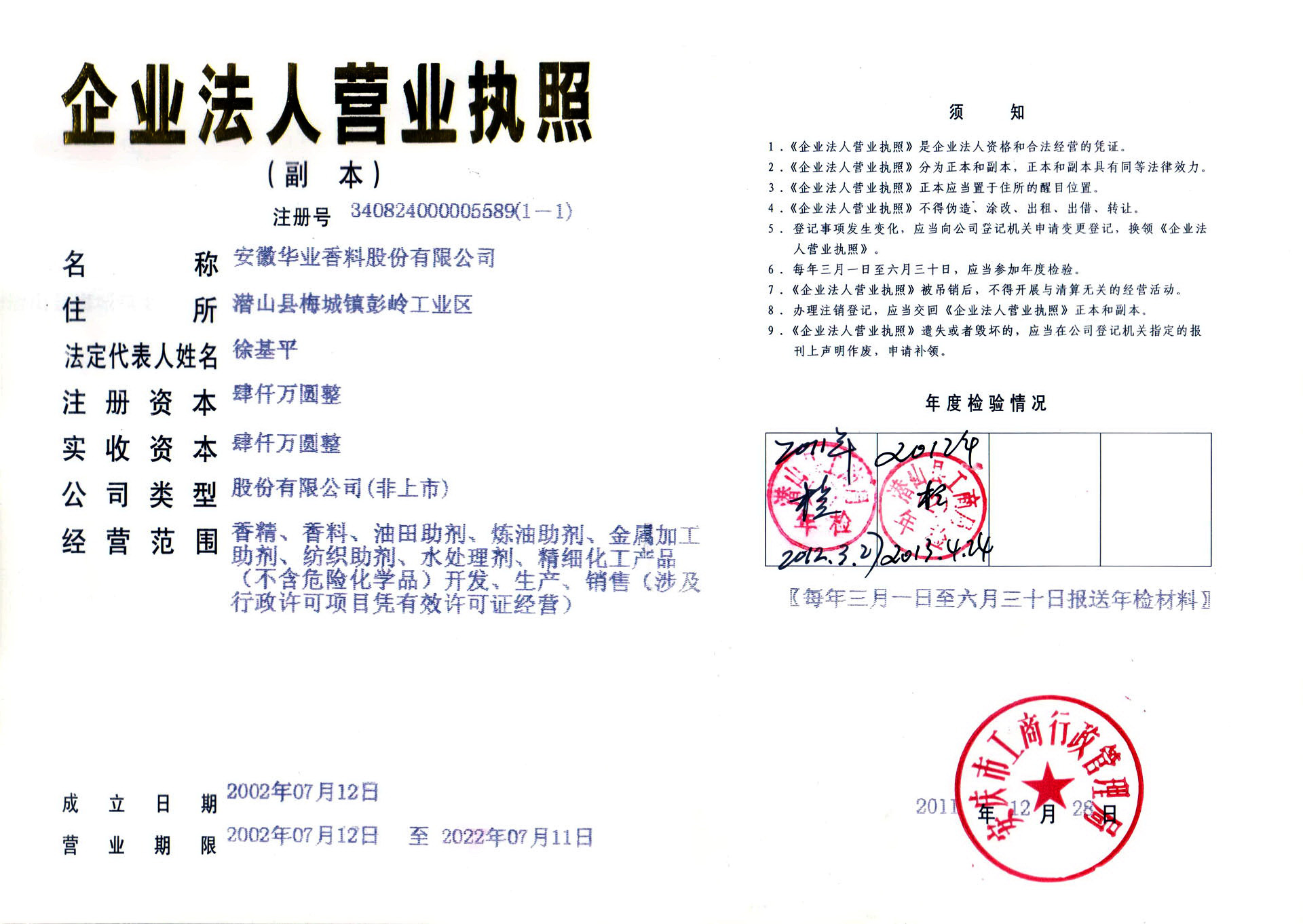 2011年公司改制更名成立安徽華業(yè)香料股份有限公司