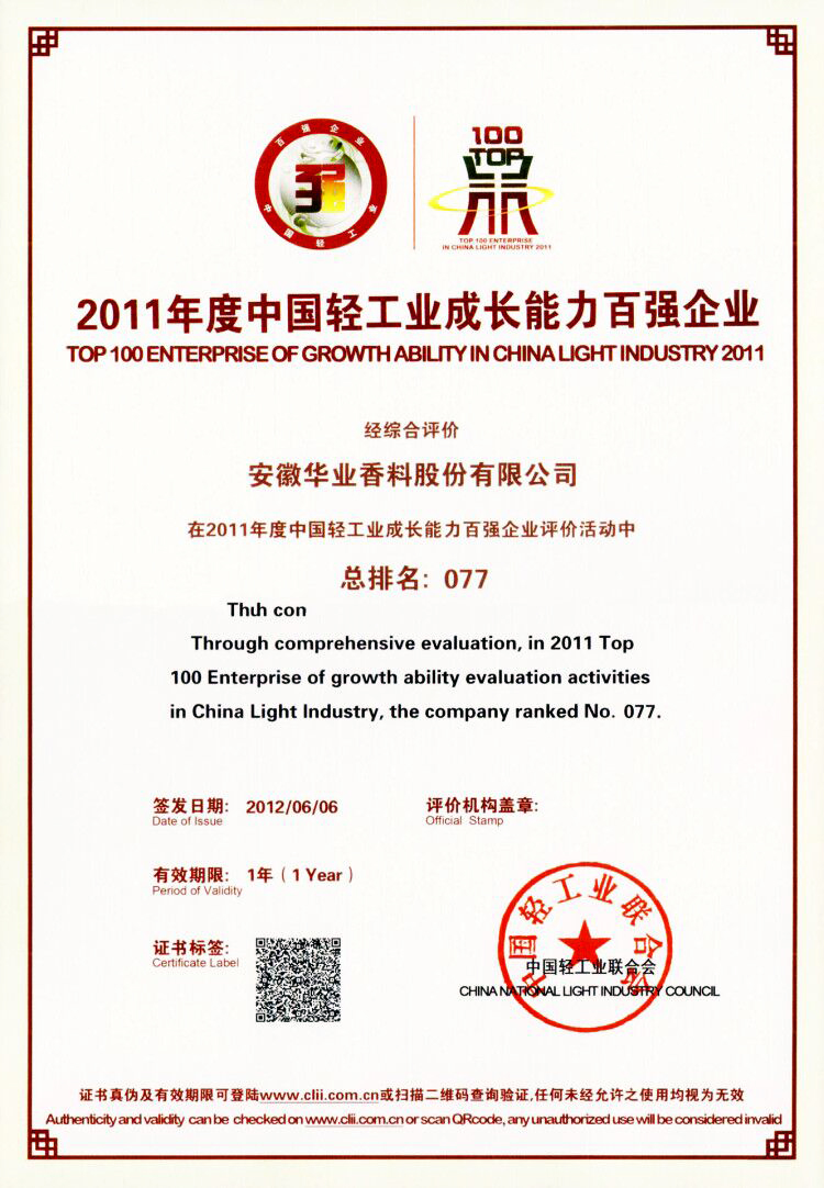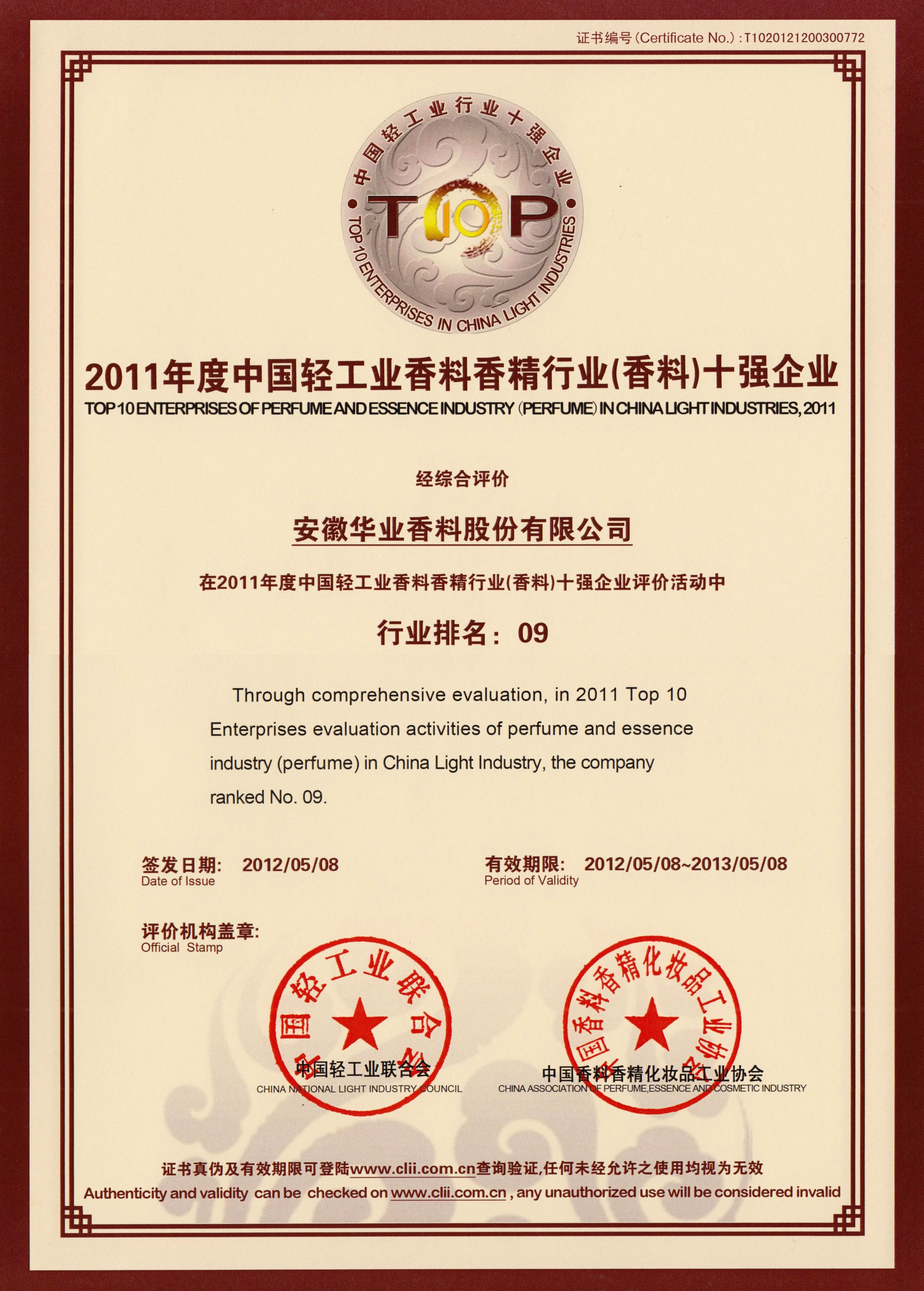 2011年榮獲中國輕工業(yè)香料香精行業(yè)(香料)十強企業(yè)