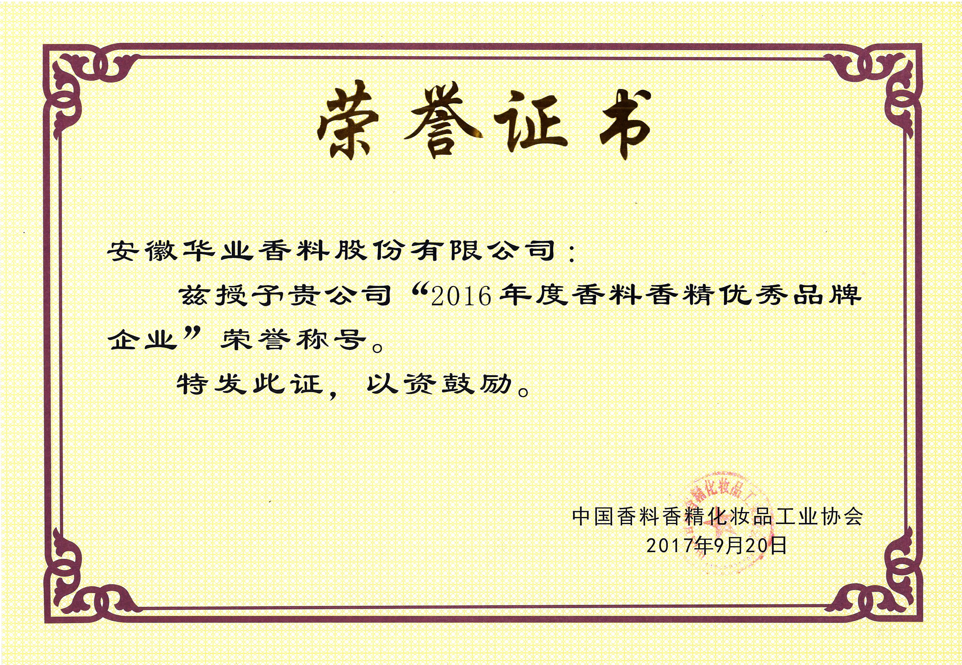 2017年獲評“2016年度香料香精優(yōu)秀品牌企業(yè)”