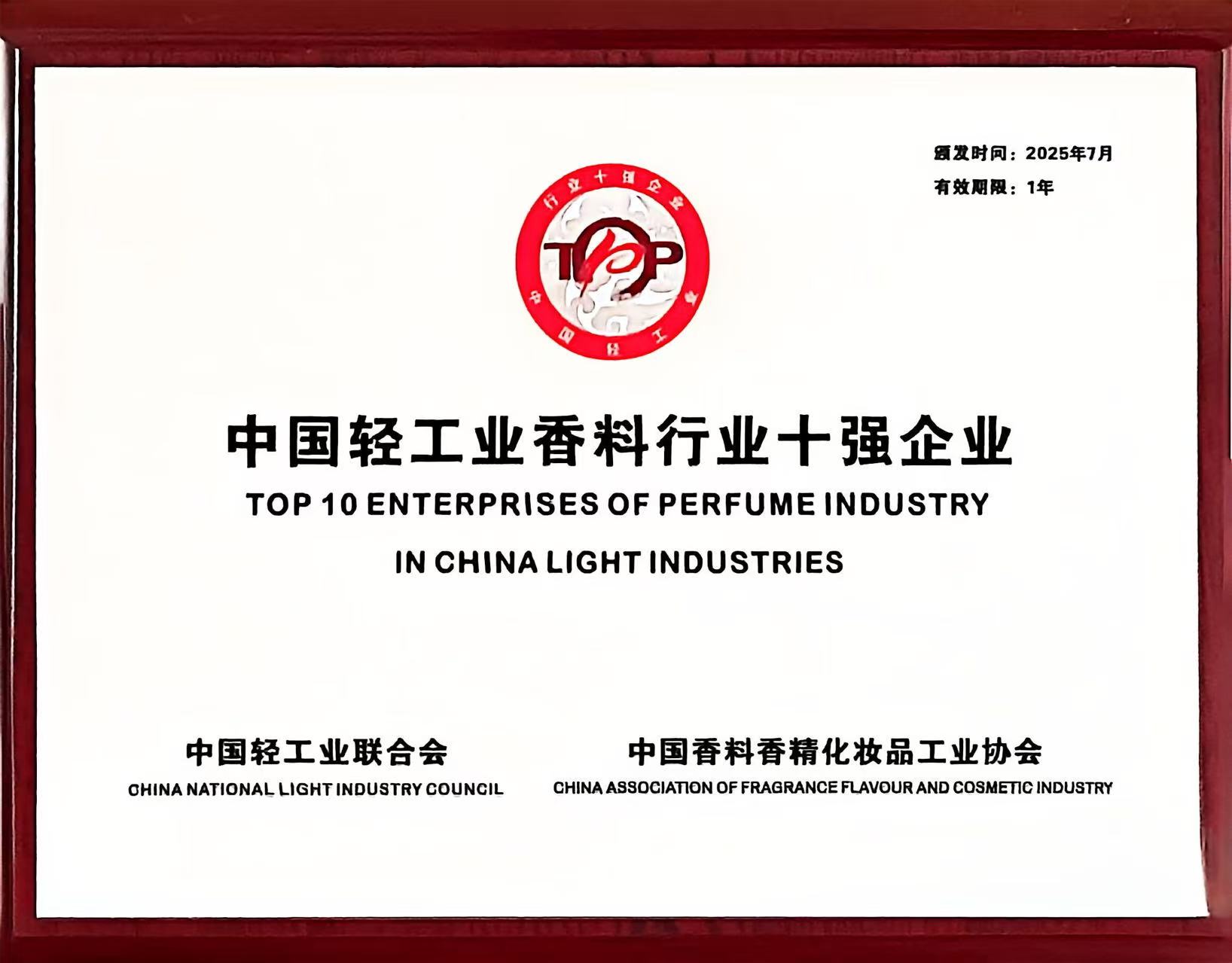 行業(yè)知名企業(yè),連續(xù)入選“中國(guó)輕工業(yè)香料行業(yè)十強(qiáng)企業(yè)”。產(chǎn)品得到寶潔、芬美意、國(guó)際香料、奇華頓、曼氏、樂(lè)達(dá)、恩格樂(lè)、德之馨、高砂等國(guó)際知名公司認(rèn)可。